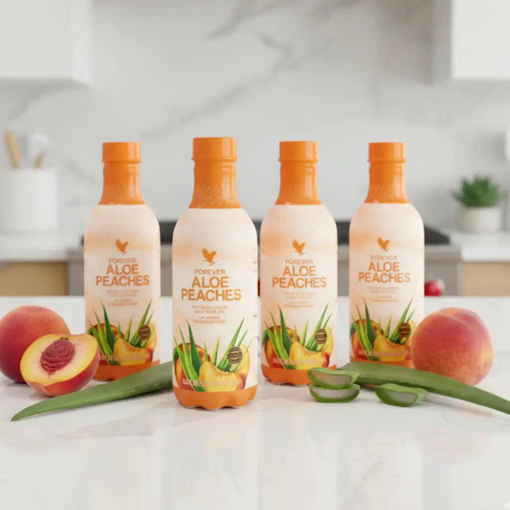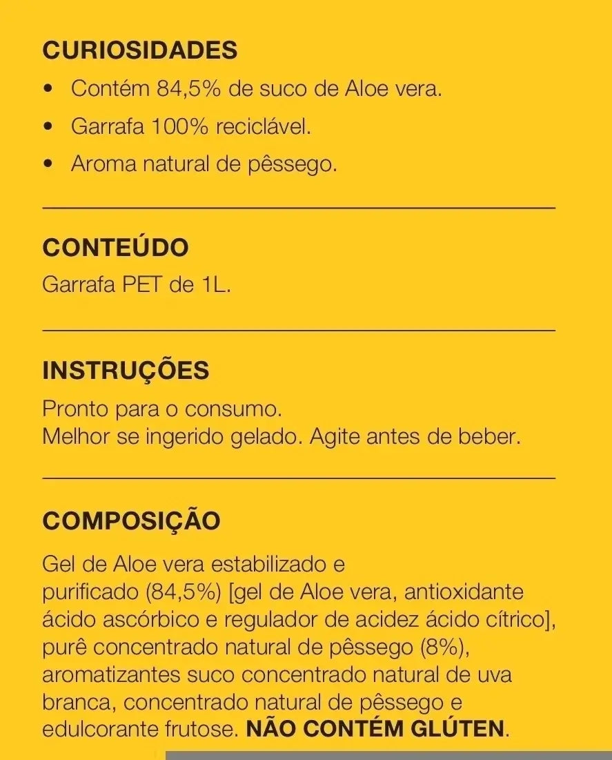 Bebida feita do puro gel de Aloe com um saboroso toque de pêssego e pedaços de Aloe vera, que elevam o sabor de pêssego maduro. Conforme indica a literatura científica, suco composto por fibras, vitaminas, aminoácidos, minerais e enzimas importantes em nosso metabolismo diário. Vitaminas: A, B1, B2, B3, B6, B8, B12, E, C, ácido fólico, betacaroteno. Minerais: magnésio, manganês, zinco, cobre, cromo, cálcio, sódio, potássio e ferro. Aminoácidos: contém 19 dos 20 aminoácidos, sendo 7 dentre os 8 aminoácidos essenciais.