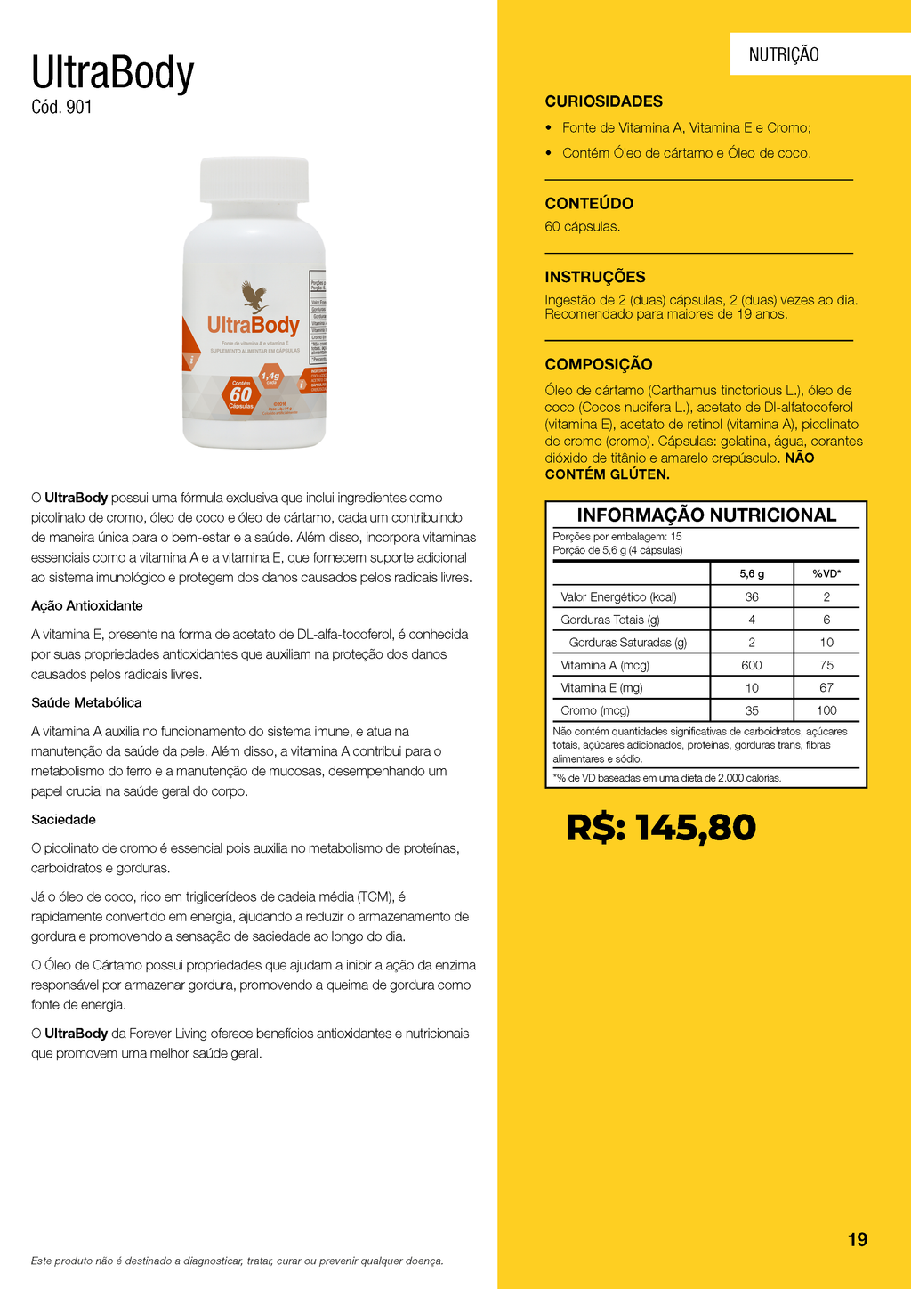 O Forever UltraBody é uma cápsulas com formulação exclusiva que combina óleo de cártamo, óleo de coco, vitaminas A e E e cromo (picolinato de cromo). Pensado para adultos que buscam praticidade e suporte nutricional no dia a dia, seu perfil reúne componentes com ação antioxidante, suporte metabólico e aporte de gorduras selecionadas. A vitamina E atua como antioxidante, auxiliando na proteção dos danos causados pelos radicais livres. A vitamina A auxilia no funcionamento do sistema imune e na manutenção da pele e das mucosas. O cromo é um mineral essencial que auxilia no metabolismo de proteínas, carboidratos e gorduras, sendo útil dentro de um plano alimentar equilibrado e associado à prática de atividade física. A base lipídica traz óleo de cártamo e óleo de coco; o óleo de coco contém triglicerídeos de cadeia média (TCM), de rápida utilização energética conforme orientação profissional, enquanto o óleo de cártamo compõe o blend de gorduras do produto.