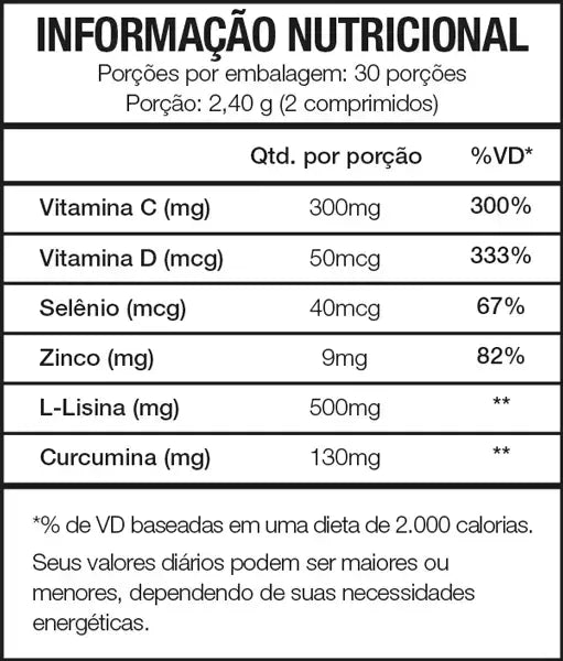 Suplemento alimentar de lisina, curcumina, vitaminas e minerais em comprimidos